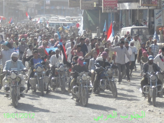 خرجت اليوم 19 من يناير 2012 بمديرية مكيراس محافظة ابين مسيرة جماهرية تعتبر الاكبر «جلال العوذلي»للتنديد بما اقدمت علية سلطات الاحتلال بالعاصمة عدن , كما جدد المشاركين رفضهم لاي انتخابات ستجرى على ارض الجنوب . ورفضهم لاي مشاريع صغيرة تنتقص في حق الجنوبيين في الحرية والاستقلال |