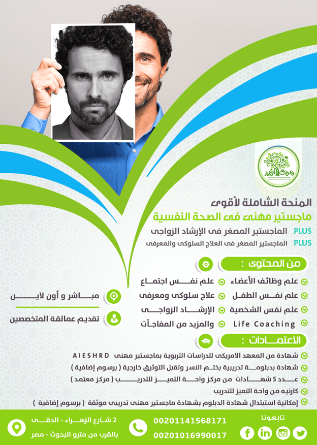 المنحة الشاملة لإعداد أخصائى التربية الخاصة لأن ده شغلنـــــا الأصلـــــــى و بمناســبة شهـــر رمضــــــان المبـــــــارك الأقوى فى مصر و الوطن العربى - من واحة التميز للتدريب خصم خصم خصم . على أقوى منحة شاملة فى التــــربية الخـــــاصة فى مصر و الوطن العربي من 2014 وحتى اليوم لله الحمد .... .تدريب خارج المنافسة ... بنعلمك اللى يخرجك فاهم مش .. حافظ كلمتين و ورقة مختومة ...نحن خارج فضاء الموثقة و المعتمدة .... نحن معتمــــدون من جهتــــــين تـــــابعتين لرئـــــاسة مجلـــس الــــوزراء المصــرى ..التدريب عملى و نظرى - مباشر و أونلاين انضم للمنحة الأصلية الأصلية الأصلية .... اللى خرجت أقوى دفعات أخصائيين على مستوى مصر و الوطن العربى من واحـــــــة التمـــــــيز .. نخبة من عمــــالقة المتخصصين فى التربية الخاصة و خبرات تتعدى 20 عاما يعنى بتكتب خبرات بتوفر عليك وقت و جهد و فلوس و تشغلك ... و حتى الأربعاء القادم 17 - 4 - 2019 ... الحق أكد الحجز للتواصل معنا على البيدج الرئيسى : https://www.facebook.com/WahaELTamyooz/ للتواصل على الموقع الالكترونى : Wahaacademy.org للاطلاع على آراء العملاء و قناتنا على اليوتيوب : https://www.youtube.com/channel/UC58...aIOTyCw/videos https://i.suar.me/2nae9/l جــــزء من المحتـــــوى باختصار لأن الواقع أكثر بكثيييير ************************************************ دبلومــــة تدريبية كاملة فى التخـــــــاطب و اضطرابات النطق والكلام ************************************* مقدمة عن التخاطب وأمراض الكلام و اللغة ودور أخصائى التخاطب. - تأخر النمو اللغوى أسباب و علاج - التأهيل التخاطبى لأطفال التوحد . - التأهيل التخاطبى لأطفال الإصابة الدمــــاغية - الخنف ( العلاج - التدخل الطبى ) . -التلعثم التشخيص و العلاج - الخطة العلاجية للتلعثم عند الأطفال / و عند الكبار . - الحُبسة الكلامية . - اللثـــــــــغات ( الأنواع – الأسباب – التشخيص - العلاج ) . - أمراض الصوت التشحيص و العلاج - العى (التعريف – الأسباب – الأنواع ) . - الخطة العلاجية للعى . - التأهيل التخاطبى لضعاف السمع وزراعة القوقعة . و الكثير و الكثير من الفنيات المتقدمة فى التشخيص و التأهيل التخاطبى دورة فى إعداد أخصائى صعـــــــوبات تعلـــــــــــم ********************************* ماهية صعوبات التعلم . الفرق بين صعوبات التعلم و التأخر الدراسى ، و التأخر العقلى و بطء التعلم . صعوبات الانتباه ، تأهيل صعوبات الانتباه اضطراب فرط الحركة وتشتت الانتباه ADHD صعوبات الإدراك و برامجها العلاجية . صعوبات الذاكرة ، تأهيل صعوبات الذاكرة . صعوبات تكوين المفهوم ، تأهيل صعوبات تكوين المفهوم صعوبات حل المشاكل ، تأهيل صعوبات حل المشكلة صعوبات القراءة ، تأهيل صعوبات القراءة برنامج كامل فى تأهيل صعوبات القراءة صعوبات الحساب ، تاهيل صعوبات الحساب من خلال برنامج كامل بداية من مهارات ما قبل الحساب حتى إجادة العمليات الحسابية الأربعة جمع – طرح – ضرب – قسمة و استخدام الكسور. صعوبات الكتابة : برنامج كامل لتأهيل صعوبات الكتابة . تأهيل صعوبات القراءة و الكتابة والحساب من خلال تدريبات حصرى حصرى حصرى ... بـــــرنامج فى العـــلاج السلــــوكى و المعـــــرفى ********************************** محــــاور الدورة الاضطرابات الانفعالية السلوكية العوامل المسببة للاضطرابات الانفعالية والسلوكية تشخيص وتقييم الاضطرابات السلوكية و الانفعالية إعداد خطة تعديل السلوك فنيات تعديل السلوك مشكلات السلوك لدى الأطفال النشاط الزائد ضعف الانتباه الفوضوية السلوك المرتبط بعدم الشعور بالأمن : القلق الخوف وتدنى اعتبار الذات الاكتئاب و إيذاء الذات الخجل اضطرابات العادات : مص الاصابع قضم الأظافر التبول اللإرادى التبرز اللإرادى اضطرابات النوم ( التقلب و المشى و الكلام اثناء النوم ) التلعثم اللزمات مشكلات العلاقة مع الرفاق العدوانية - تنافس الأشقاء - الصحبة السيئة - العزلة الاضطرابات الاجتماعية الغضب – السرقة - الكذب –الغش – الكلام البذئ الحرائق – التخريب - الهروب من البيت – الهروب من الم