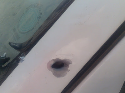 قوات الجيش والأمن المركزي المنتشرين بالملاح يطلقون النار على الموطنين والممتلكات والبيوت والسيارات العابرة وهذه صور لسيارة صالون بيضاء رقم سعودي يملكها الموطن نبيل الحطيبي نجوا باعجوبة هوا وعائلته بعد إن تعرضوا لوابل من الرصاص في هذا اليوم الثلاثاء ظهر الموفق28/12/2010