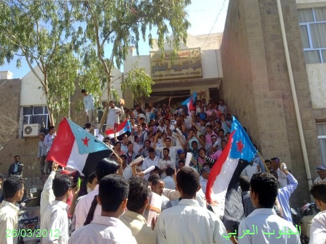 وردد المشاركون في الفعالية الطلابية هتافات مناوئة للحكومة المركزية في صنعاء مطالبين بما أسموه "تحرير الجنوب وإستقلاله". واقيمت التظاهرة في محيط منطقة شهدت ولادة ماعرف خلال القرن الماضي "بحكومة اتحاد الجنوب العربي" حيث مارست هذه الحكومة التي باتت هدفا لشعارات محتجين في الجنوب أعمالها من وسط مباني تقع على بعد أمتار من موقع التظاهرة . واعتمد دارسون منذ أسابيع نسخة جديدة للإحتجاجات السلمية في عدة محافظات جنوبية وأطلقوا عليها "يوم الطالب الجنوبي" الذي دشن أعماله من عدن قبل أسابيع وتفاعلت معه محافظات أخرى http://http://adenalghad.net/uploads...332761732.jpeg http://http://adenalghad.net/uploads...332761637.jpeg http://http://adenalghad.net/uploads...332761496.jpeg http://http://adenalghad.net/uploads...332761156.jpeg http://http://adenalghad.net/uploads...332760863.jpeg |