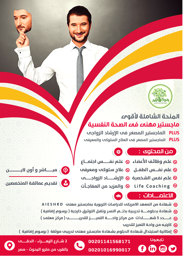 أقوى ماجستير مهنى فى الصحة النفسية .. واحة التميز احجز مكانك فى الأقوى فى مصر والوطن العربى - حضور مباشر و عن بعد ( أونلاين ) و باعتماد حكومى ودولى امريكى ... حتى الأربعاء القادم 6 مارس 2019 م التدريب يوم واحد أسبوعيا - على مدى 6 شهور ليه تأخد دبلومة تدريبية لما ممكن تأخد 2 شهادة ماجستير مهنى تدريبى فى الصحة النفسية منها شهادة من جهة حكومية + شهادة دولية .. وليس شهادة واحدة - وكمان معاه عدد 2 ماجستير مهنى مصغر في الإرشاد الزواجى + العلاج السلوكى و المعرفى + شهادات من واحة التميز للتدريب فقط العرض مستمر للحجز حتى الأربعاء القادم 6 مارس 2019 م و يمكن الحجز بسداد الرسوم كاملة أو النصف و الباقى حتى 3 أقساط شهرية ؟ وممكن تكمل دكتوراة مهنية تدريبية بعدها - وحصريا من واحة التميز للتدريب المعتمدة من جهتين تابعتين لمجلس الوزراء المصرى. تخفيضات كبيرة للإخوة العرب - تدريب حقيقى متخصص فى : الصحة النفسية - الإرشاد الزواجى - العلاج السلوكى - علم نفس وظائف الأعضاء - دورة لايف كوتشينج مكثفة - علم نفس الاجتماع - علم نفس الطفل - علم نفس الشخصية يمكنكم الاستفسار عن الدبلوم التدريبى والماجستير مهنى والدكتوراة المهنية التدريبية فى إدارة الأعمال و فى التخاطب و اضطرابات النطق و الكلام و فى صعوبات التعلم و فى الإعاقة العقلية رابط البيدج الرئيسية لواحة التميز للتدريب : http://bit.ly/2oNwRvW للإطلاع على آراء المشاركين برامج واحة التميز الضغط على الرابط التالى : http://cutt.us/L9pQ3 الموقع الالكترونى : http://wahaacademy.org/ https://i.suar.me/AM3VV/l عايز تحصل على أقوى ماجستير مهنى فى الصحة النفسية ؟ مباشر و أونلاين يعنى أينما كانت دولتك ممكن تشترك ؟ و التدريب متخصص على أيدى أقوى المتخصصين فى الوطن العربى بخبرات تصل إلى 30 عاما بمسمى ماجستير مهنى فى الصحة النفسية A I E S H R D باعتماد المعهد الامريكى للدراسات و ماجستير مهنى ثانى باعتماد حكومى بختم نسر( يمكن التوثيق خارجية مصرية و قنصليات عربية ) يعنى هتحصل معانا على 2 ماجستير مهنى تدريبى يمكنكم الاستفســار : 1- عن الدبلوم المهنى فى إدارة الأعمال المعتمد حكوميا + دبلوم فى إدارة الجودة مجانا M B A و يمكن التكملة لماجستير مهنى فى إدارة الأعمال https://i.suar.me/mWp4j/l يمكنكم الاستفسار عن : 2- الدبلوم التدريبى فى إعداد أخصائى التربية الخاصة مع إمكانية التكملة لماجستير مهنى تدرريبى فى التخاطب و اضطرابات النطق أو فى صعوبات التعلم أو فى الإعاقة العقلية 3 – أقوى منحة شاملة فى إعداد أخصائى التوحد ... مباشر و أونلاين لمدة شهر جمعة و سبت أسبوعيا ... أن تفهم بعمق و تخصص https://i.suar.me/Borgd/l 4 - أقوى دبلومة متقدمة ومتخصصة للمتخصصين و الممارسين فقط للعلاج الوظيفى فى العـــلاج الـــــوظيفى ... من واحة التميز للتدريب البداية 8 مارس 2019 م شهرين يوم الجمعة فقط https://i.suar.me/52Lzr/l للتواصل و الاستفسار : 00201141568171 – 00201016990017 متوفر واتساب و ايمو و فايبر العنوان : 2 شارع الزهراء الدقى بالقرب من مترو البحوث الجيزة – مصر . |