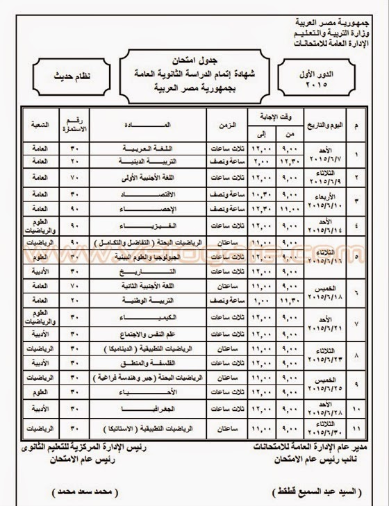 ويمكنك الام تحميل جدول امتحانات الصف الثالث الثانوى 2015 علمي وادبي*