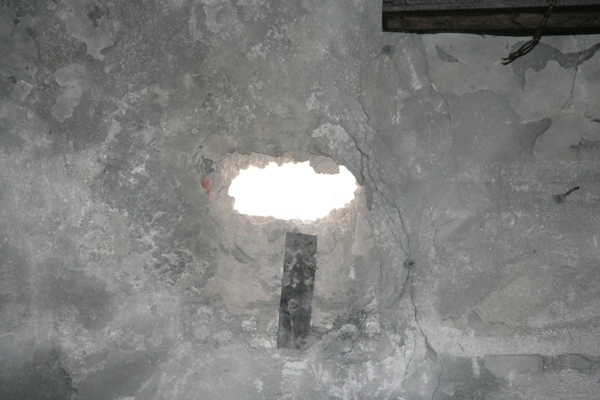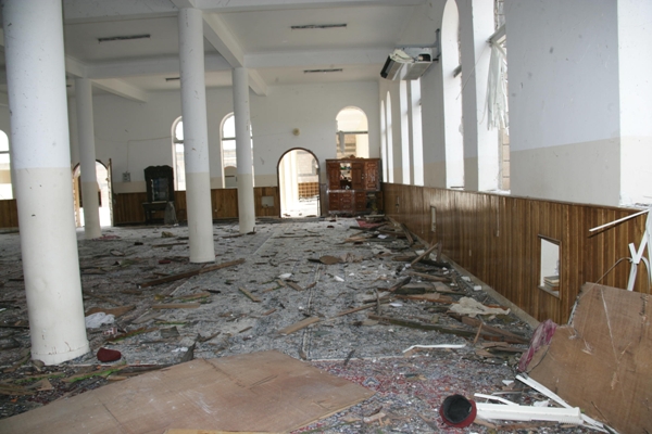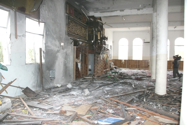 لا توجد فتحة لدخول الصاروخ من مقدمة المسجد كما قيل.... كما أن انبعاج زجاج الشبابيك للخارج يدل عل أن الانفجار كان بعبوة من داخل المسجد. ![]() |