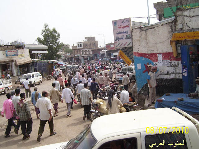 أقيم صباح هذا اليوم الموافق ٨/٧/٢٠١٠م مهرجان سلمي حاشد حضره عشرات الآلاف من أبناء الجنوب وعدد كبير من قيادات ونشطا الحراك السلمي يتقدمهم الإخوة "الشيخ عبدالرب النقيب وعوض الصلاحي وعلي الغريب ومحمد طماح وصالح العيسائي وعبدالعزيز المنصوري " وقد أقيم هذا المهرجان تواصلا مع فعاليات الحراك السلمي المنطلق نحو التحرير واستمرارا ليوم المعتقل الجنوبي وتضامنا مع كل مناطق الجنوب المحاصرة وفي مقدمتها الضالع بوابة النصر الجنوبي ومع حضرموت الخير والكرامة ومع مدينة الحرية وعاصمة الجنوب عدن ومع أبطالها الذين يسطرون أروع البطولات واستنكارا للمذابح التي ترتكبها قوات الاحتلال وكان آخرها مذبحة يوم أمس ٧/٧/٢٠١٠م في مدينة عدن الباسلة والتي راح ضحيتها شهيدان وعدد من الجرحى